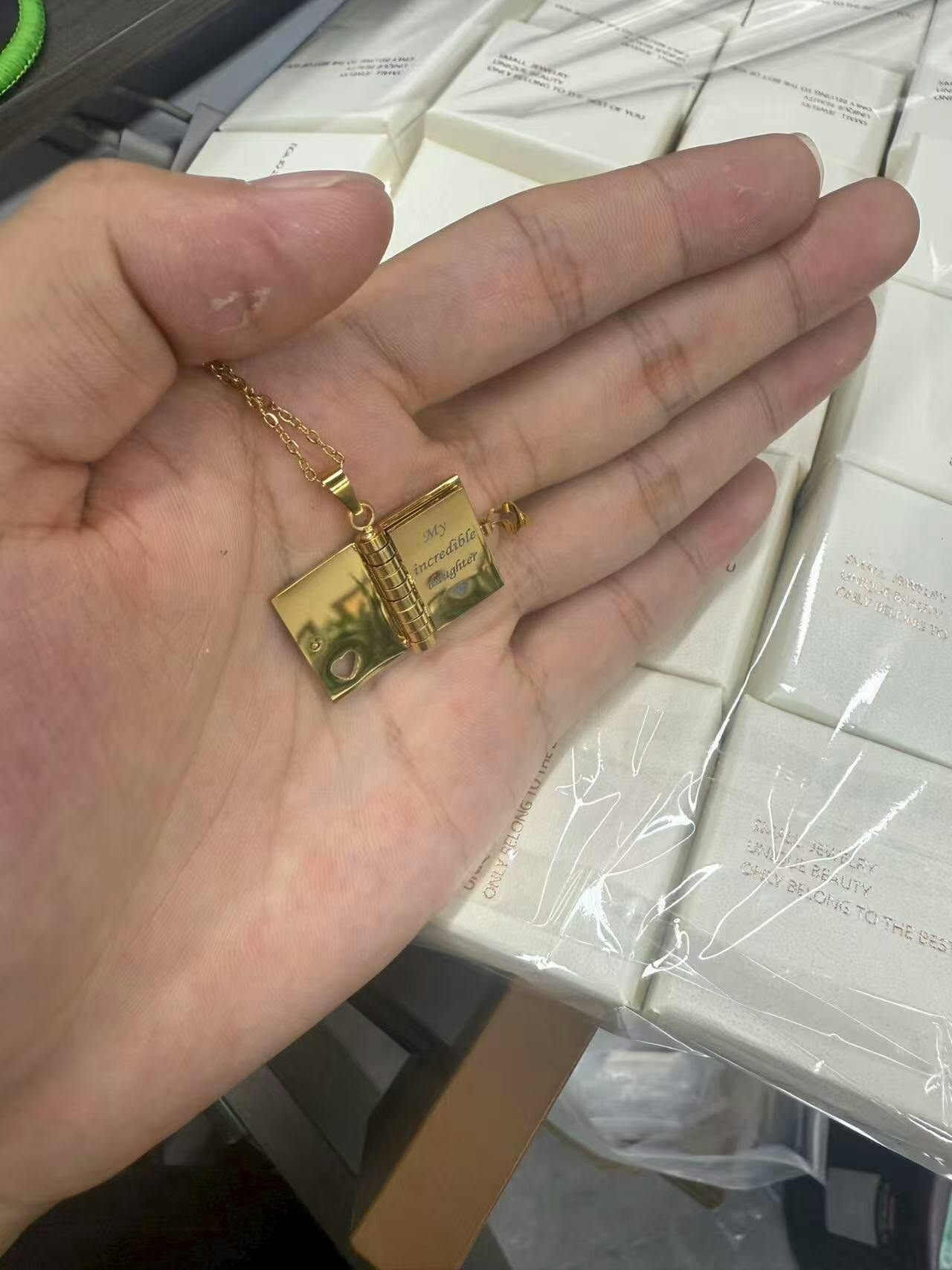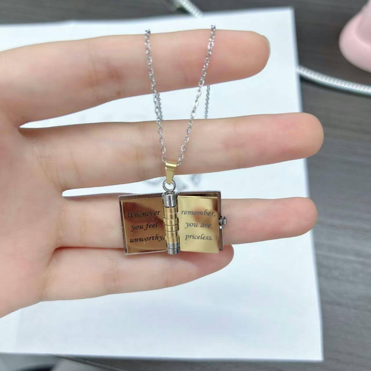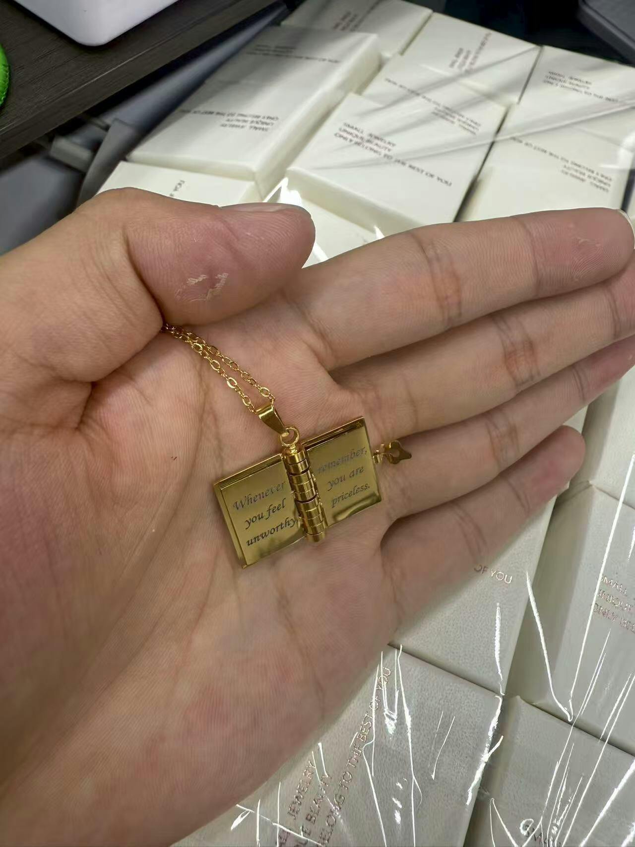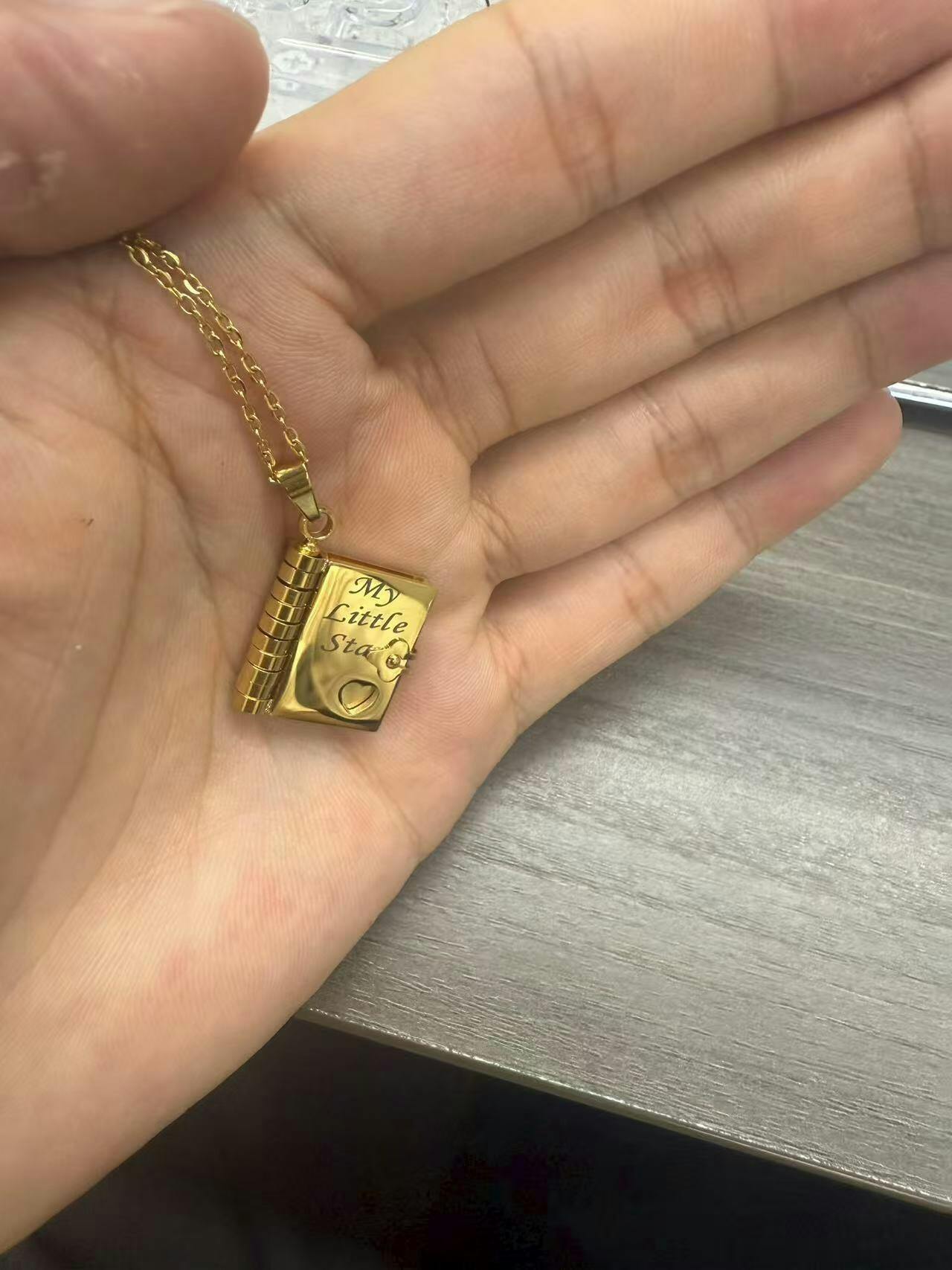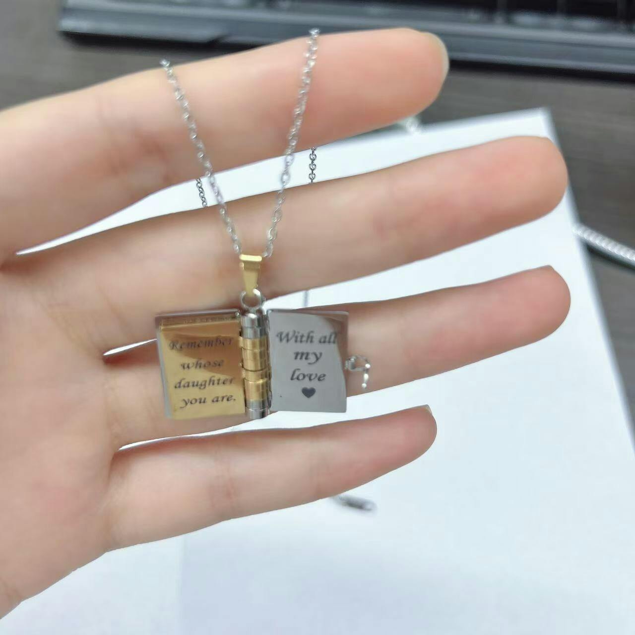 π A Tale Close to Your Heart: Crafted with precision and passion, our Custom Book Necklace is more than just jewelry; it's a personal narrative. Open the tiny pages to discover a world of possibilities. Your story, your memories, or a cherished message β all elegantly captured within the delicate pages of this miniature book.